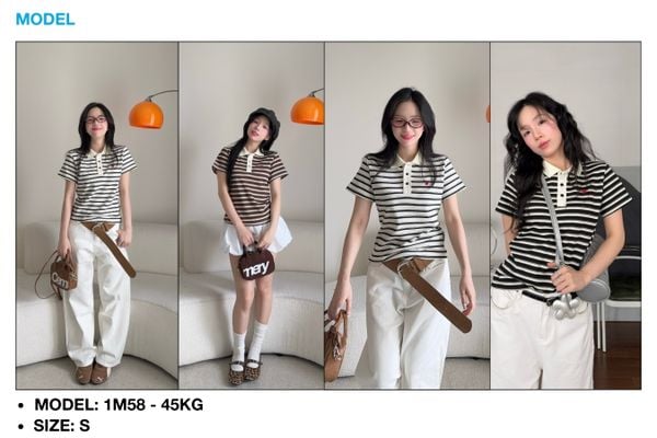 - Thiết kế độc đáo: Áo baby polo tay ngắn, phối sọc ngang tinh tế trên toàn thân áo. Cổ polo phối màu trắng, nút bấm đồng bộ màu sắc tạo sự hài hòa tổng thể. Logo trái tim đỏ thêu 3D nổi bật ở ngực trái – chi tiết tạo dấu ấn riêng cho người mặc, trẻ trung nhưng vẫn tinh tế.