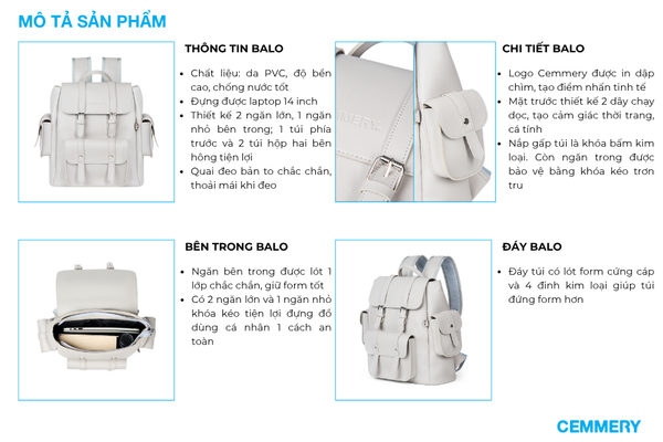 • Chất liệu: Da PVC cao cấp chống nước tốt, bền đẹp, không bong tróc và dễ lau chùi. Quai đeo êm, bản to, dễ điều chỉnh mang thoải mái cả ngày dài.