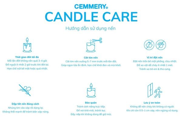 Hướng dẫn sử dụng / bảo quản: Khi đốt lần đầu, nên giữ nến cháy ít nhất 2–3 giờ để lớp sáp tan đều và tránh lõm tâm nến. Cắt tim nến xuống 5–7 mm trước mỗi lần đốt, Giúp ngọn lửa ổn định, hạn chế khói đen và mùi khét. Tránh ánh nắng trực tiếp, để nơi khô mát, tránh bụi, đậy nắp khi không dùng để giữ mùi.
