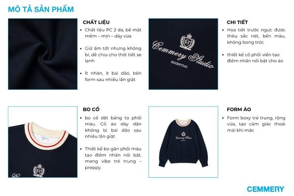+ Sweater: Logo “CEMMERY Studio” thêu chỉ dày dặn nổi bật, bo cổ dệt phối viền thể thao cá tính, tay và lai áo bo gọn gàng.