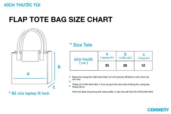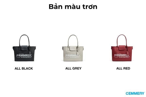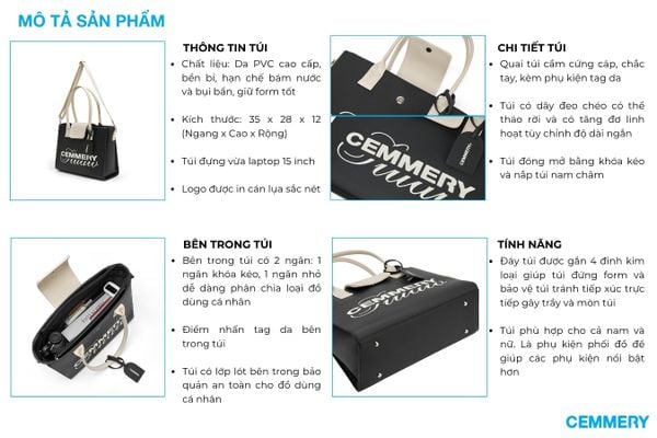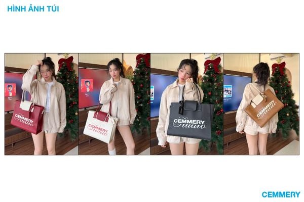 Thiết kế: Logo “CEMMERY Studio” in cán lụa nổi bật, nắp gập bằng nam châm và khóa kéo bảo vệ miệng túi, có kèm tag da. Bên trong túi có lớp lót giúp giữ form cứng cáp.